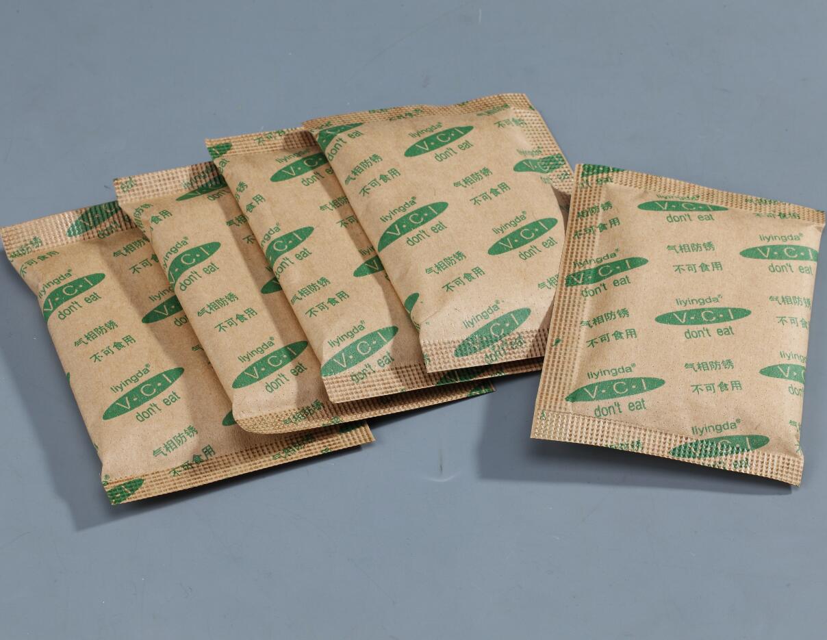 氣相防銹干燥劑是用氣化性氣相防銹紙將吸濕材料硅膠填充,三面熱封成袋而成的具有可以揮發金屬氣相緩蝕劑氣體,同時又可以將包裝內容物中的水分去除的雙效金屬防銹包裝材料,這種氣相防銹干燥 劑通過防銹紙中的氣相緩蝕劑的揮發,在包裝內容空間中產生一定濃度的氣相緩蝕劑氣體,可以附著在金屬和被包裝物的表面,形成保護膜,防止氧氣、濕氣等環境氣氛對金屬的腐蝕;同時干燥劑可以吸收水分,保持包裝內容空間安全的相對濕度,阻斷金屬遇水生銹的電離反應,起到雙效的防銹保護,從而達到防銹效果。